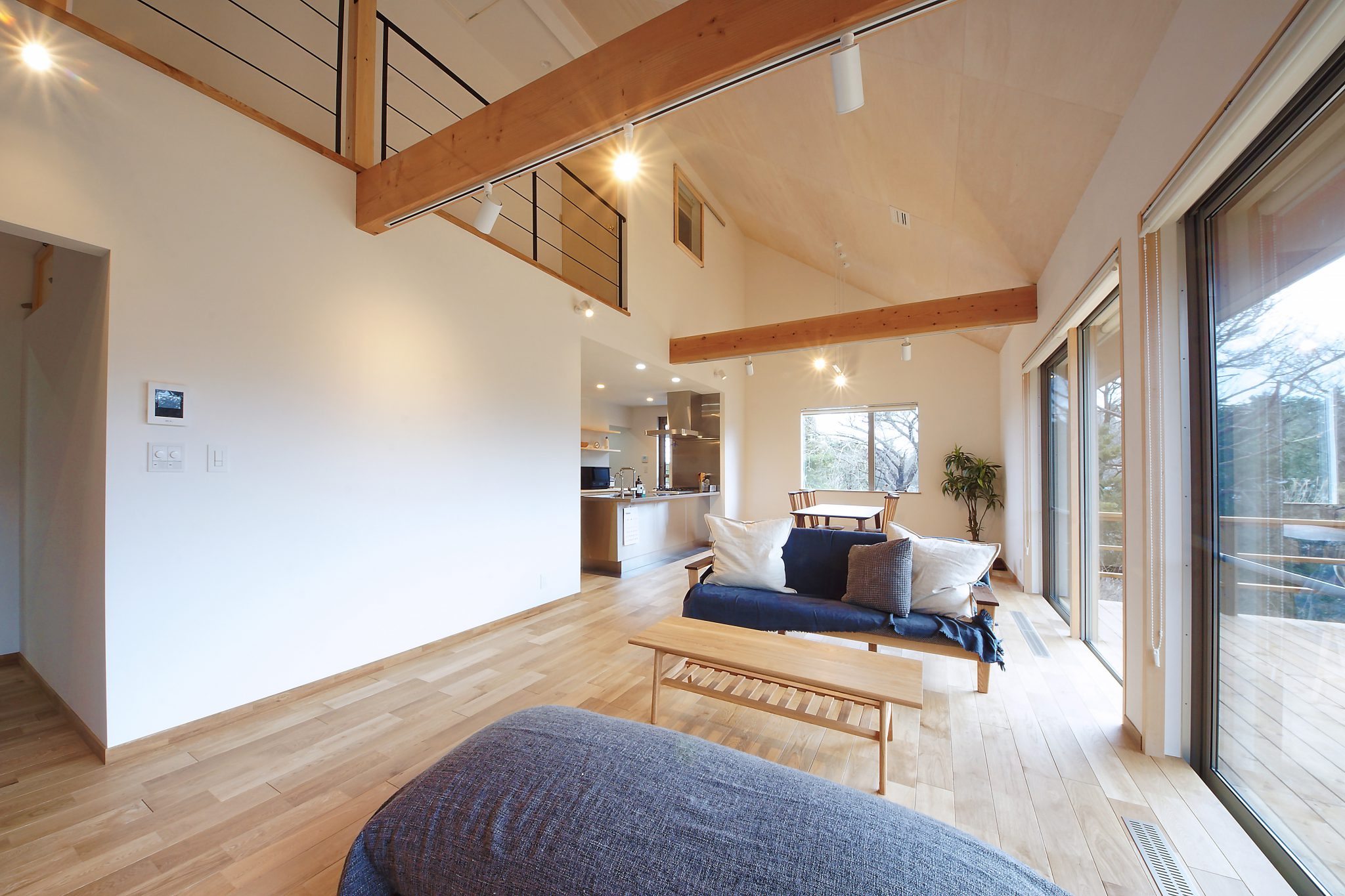 勾配天井で空間にメリハリをつけた開放的なリビング。