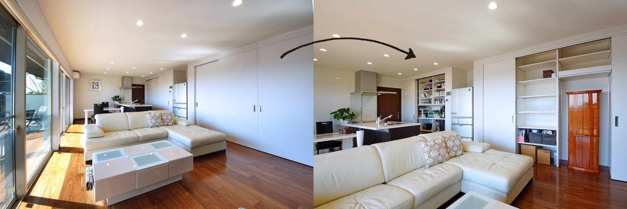 大容量の壁面収納を造作して室内をスッキリ保つことで、日常を感じさせないリゾートテイストの暮らしを盛り立てます。