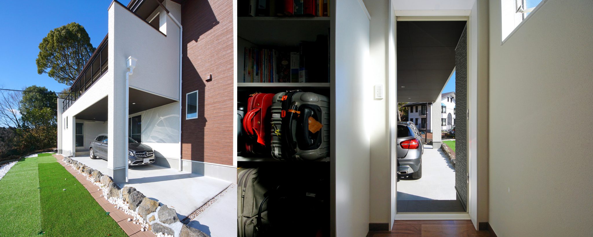 大海原を目の前に、広い間口のベランダで余暇を楽しまれるご主人様。その広さを利用して、軒下には自家用車が収まるスペースを計画しました。玄関とは別に室内への出入口を設けることで、雨の日でもゆったりお出かけできる動線を確保しています。