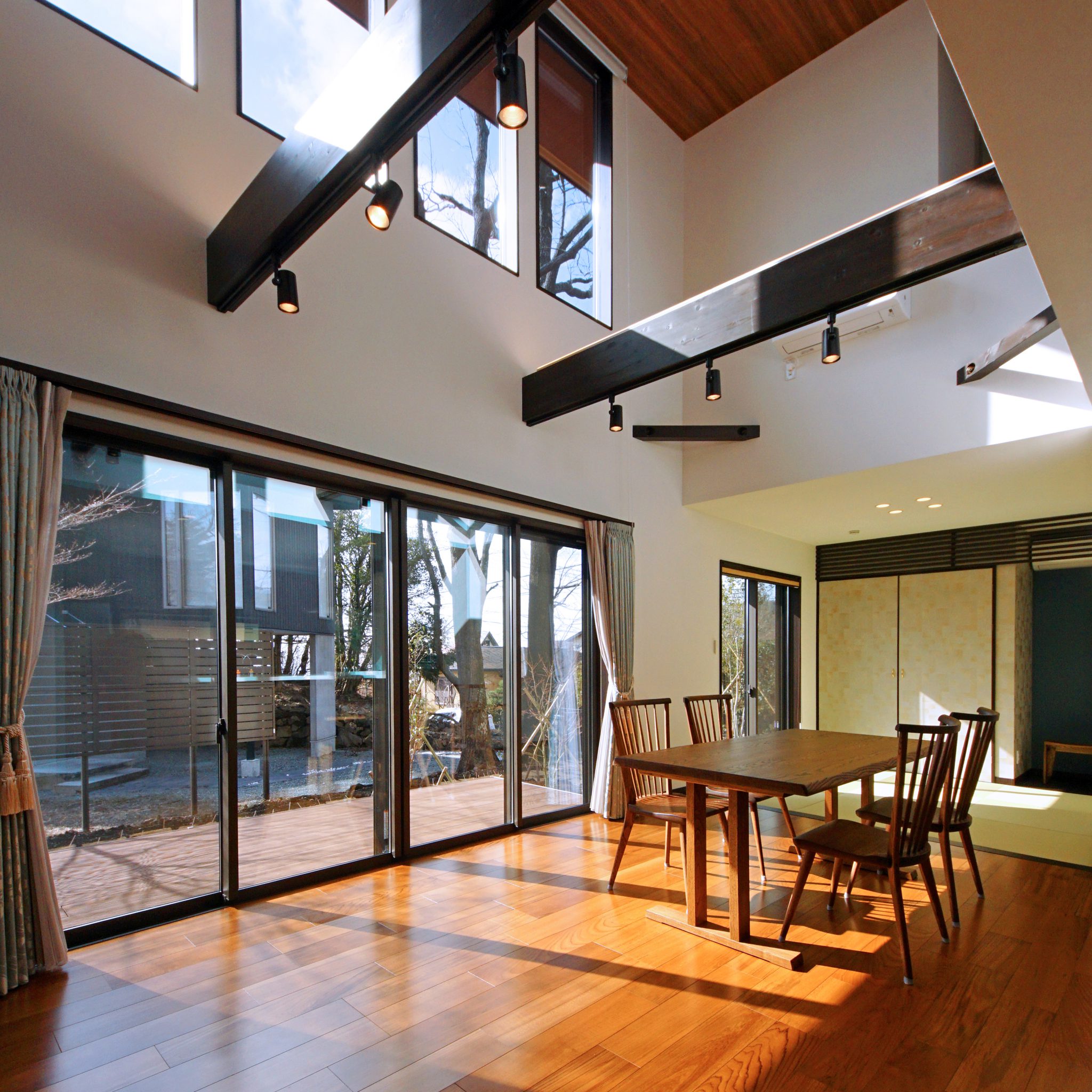 リビングに大きな吹抜けのある、開放的な生活空間。タタミルームを併設することで、横になったり、家事をしたり、より過ごしやすい生活スタイルを確保しています。