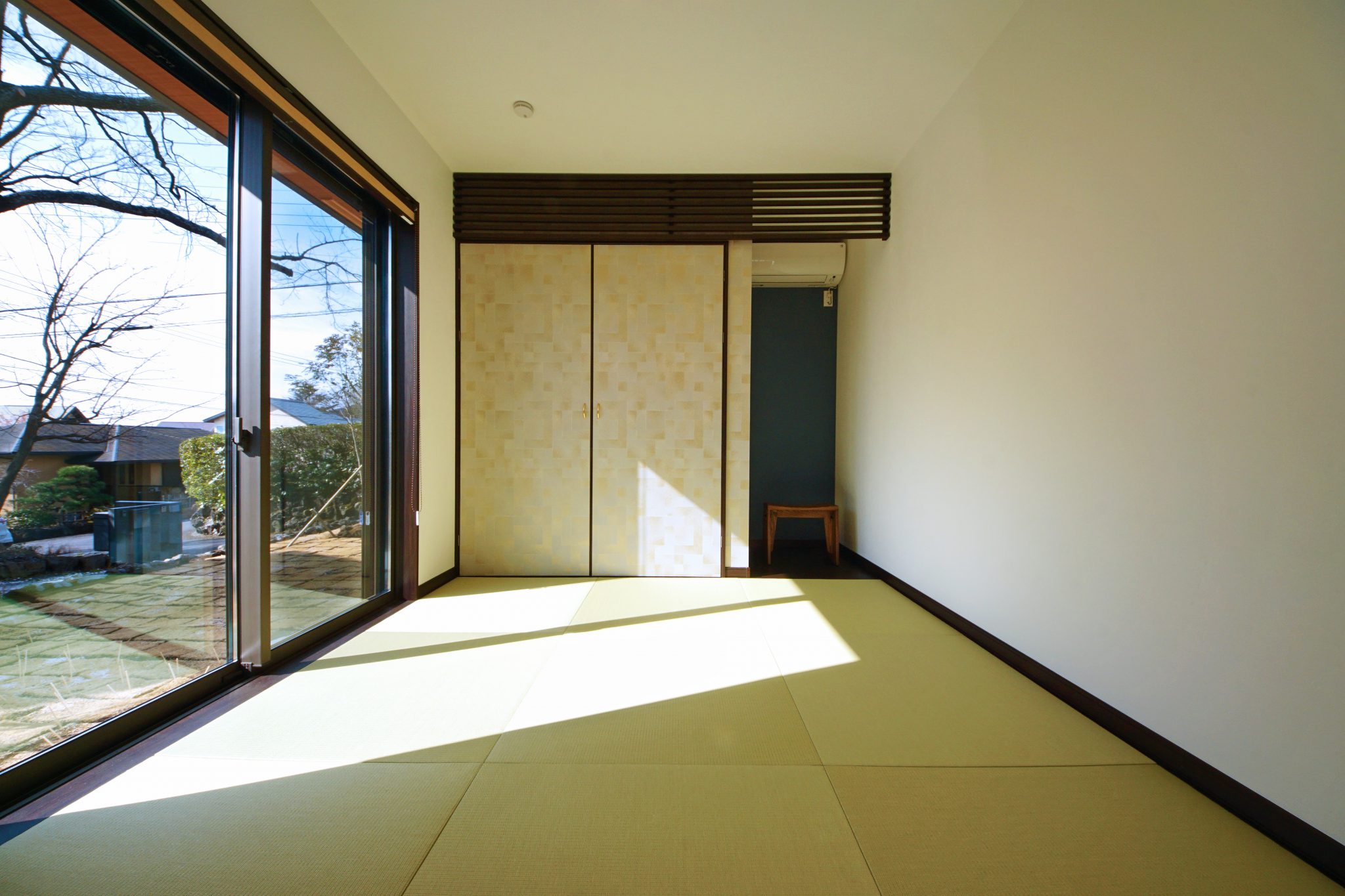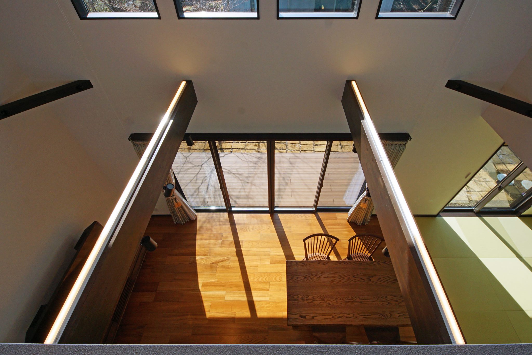 北側にあるゲストルーム。壁一面に設けた大開口の内窓は、リビングを見下ろすことができるだけでなく、南面のハイサイドウィンドウから陽の光を目一杯取り込めるよう配置しています。
