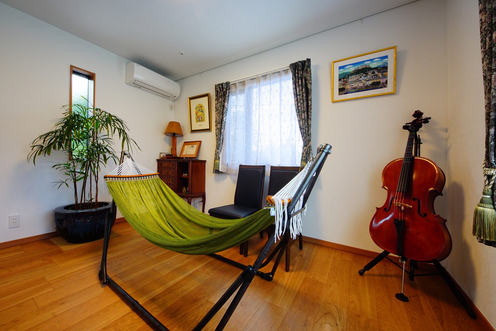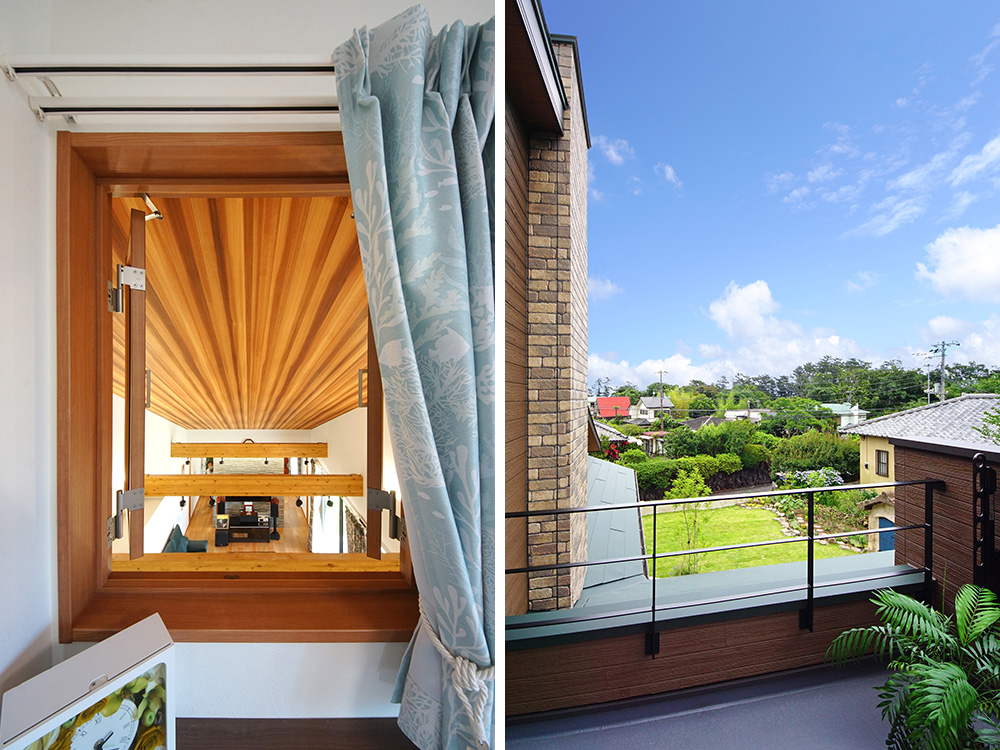 2階ゲストルームには内窓があり、勾配天井を目前にLDをダイナミックに見下ろすことができます。