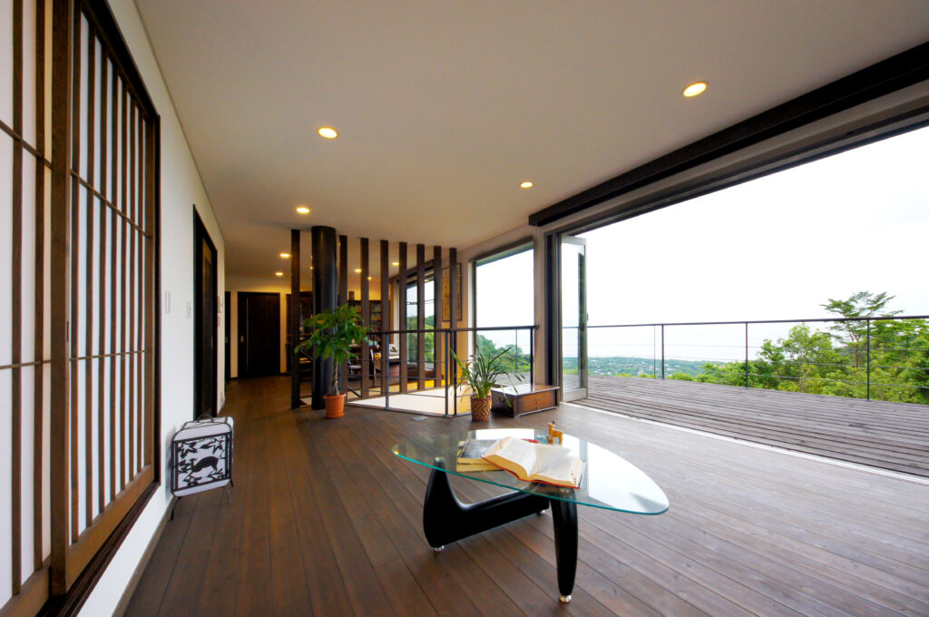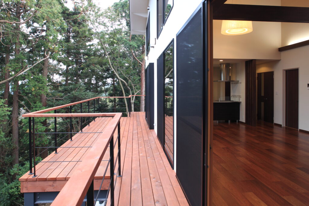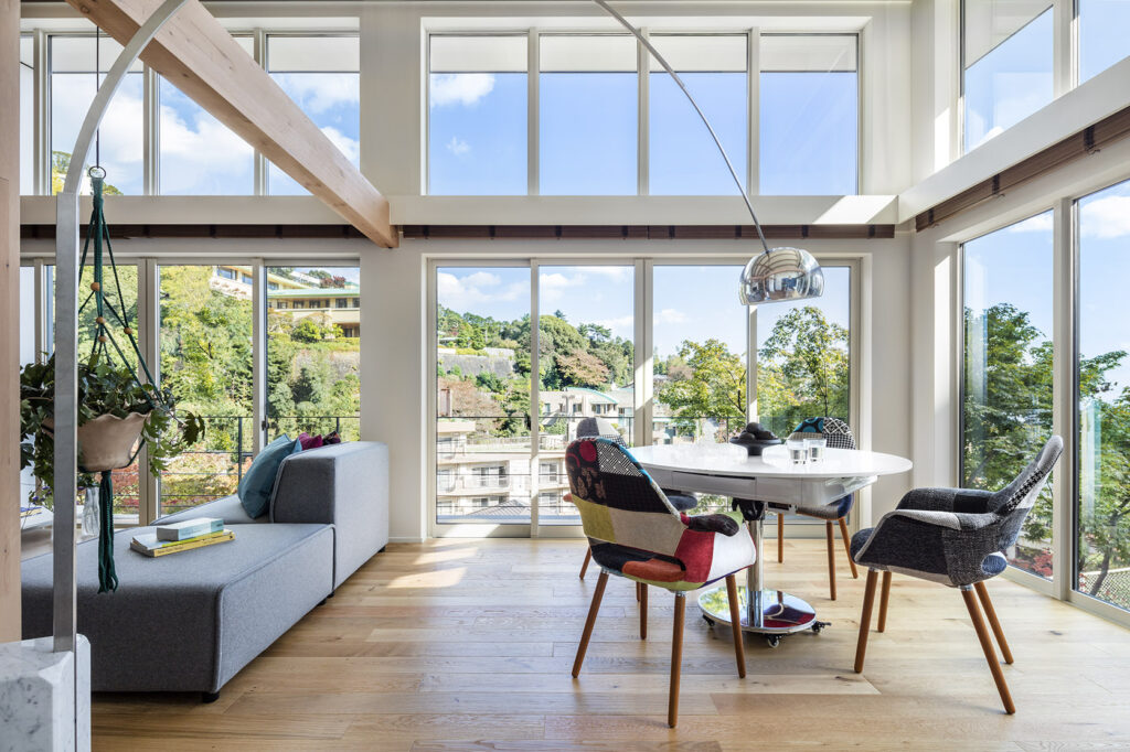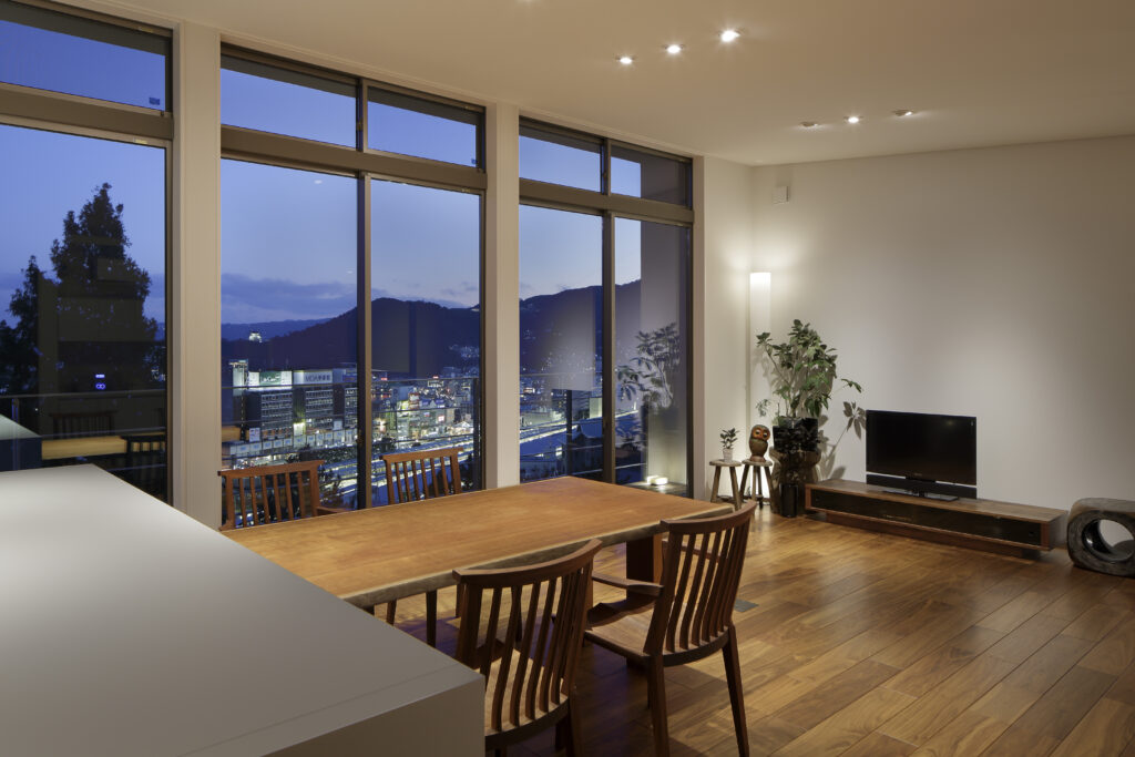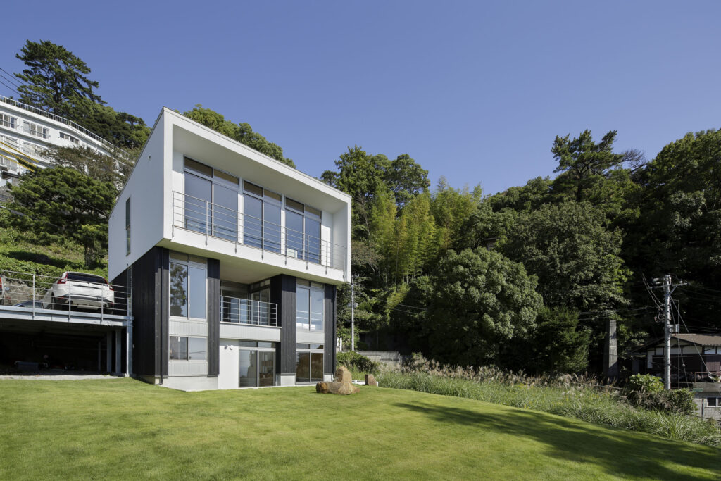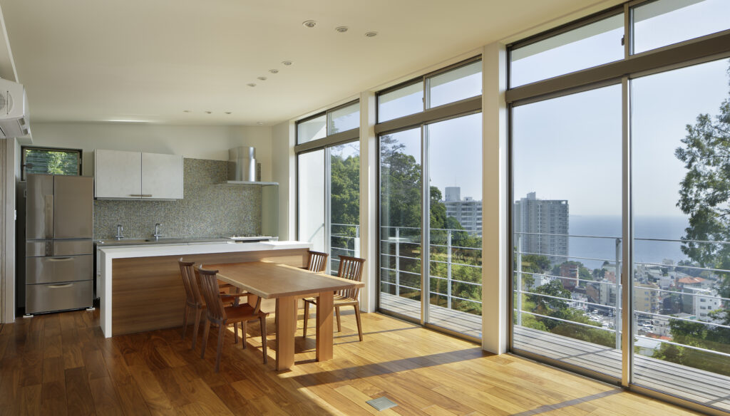 海側の景色を目いっぱい取り入れるため、強い強度と大開口を実現するSE構法を採用。3階建てでありながら一面に窓を配置することが出来、見た目にもスタイリッシュな外観になりました。 白を基調とした室内は、重量感のあるウォールナ […]