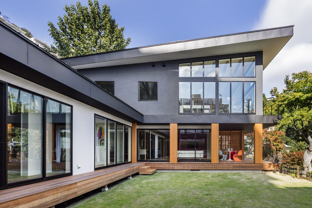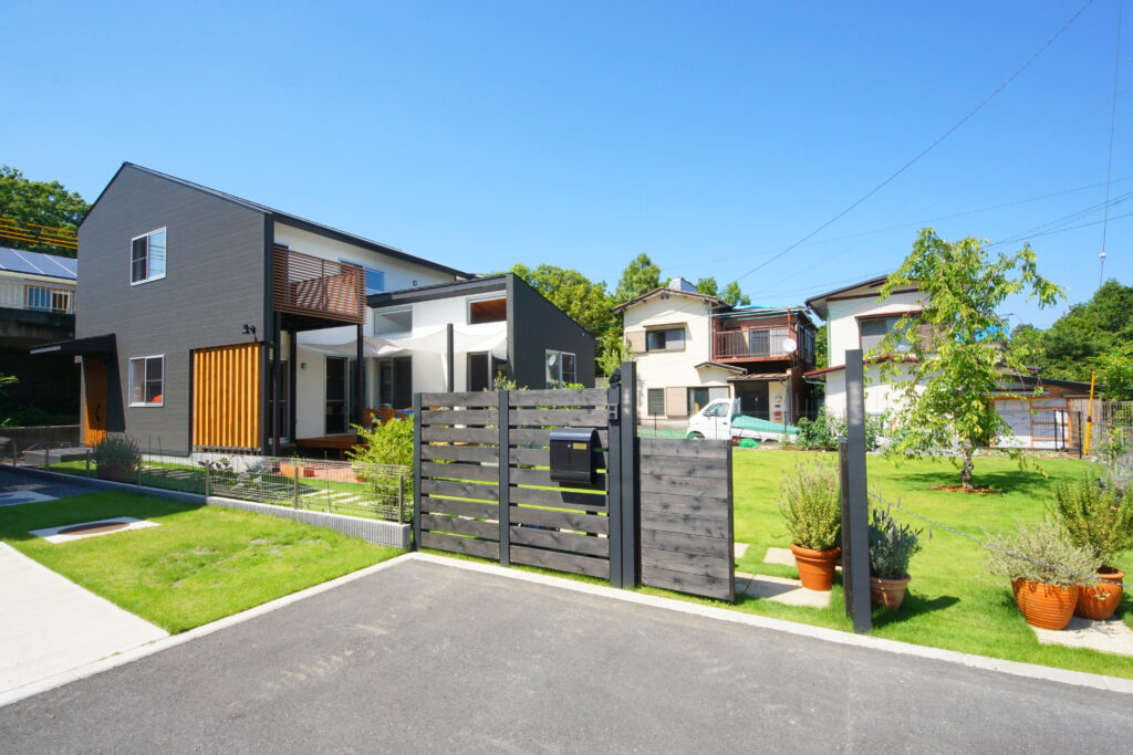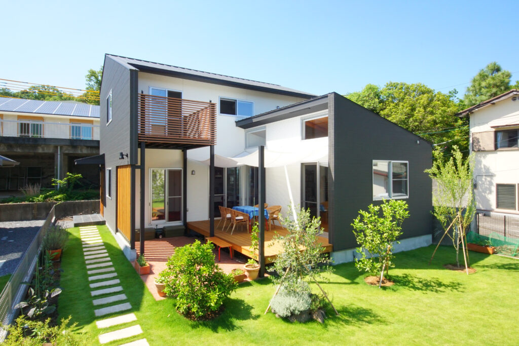 白と黒と天然素材のコントラストが緑の庭に際立つモダンな家。新興住宅地にあるため、まわりに家が建つことを予定してテラスを間取りの中央に据えました。 テラスを囲むようにL字に配置したLDKは、どこにいても明るく快適。家具・イ […]