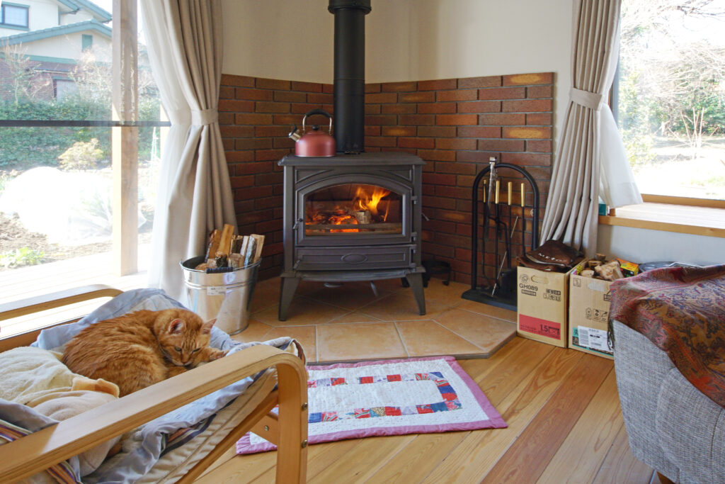 ニャンコぬくぬく、OMソーラーと薪ストーブのある暮らし