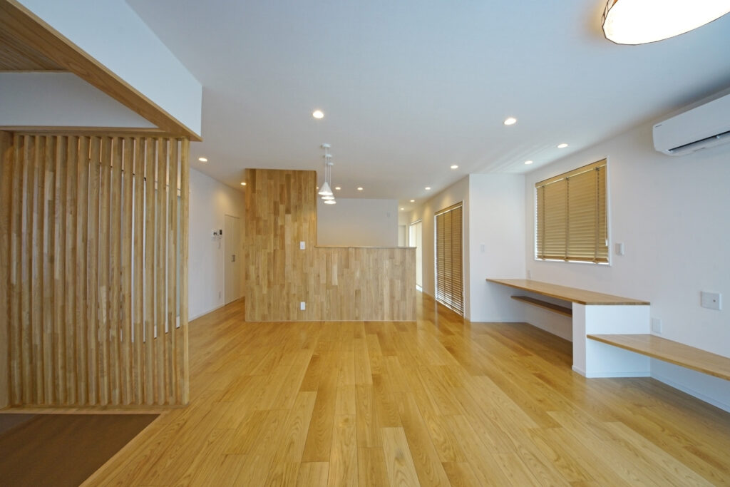 多くの開口部を設けた明るく開放感のあるLDK。リビングに吹抜けを計画したことで、キッチンと天井の高低差ができメリハリのある空間に。