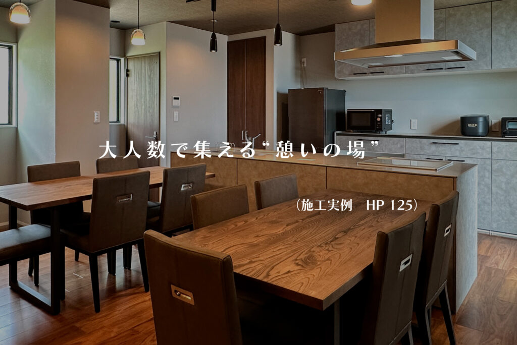 シンプルな中にも立体感を持たせた外観。 周辺環境の状況を考慮した計画によりスッキリとした印象に。 大人数で集まることが多いとのご要望から実現した広々ダイニング。
